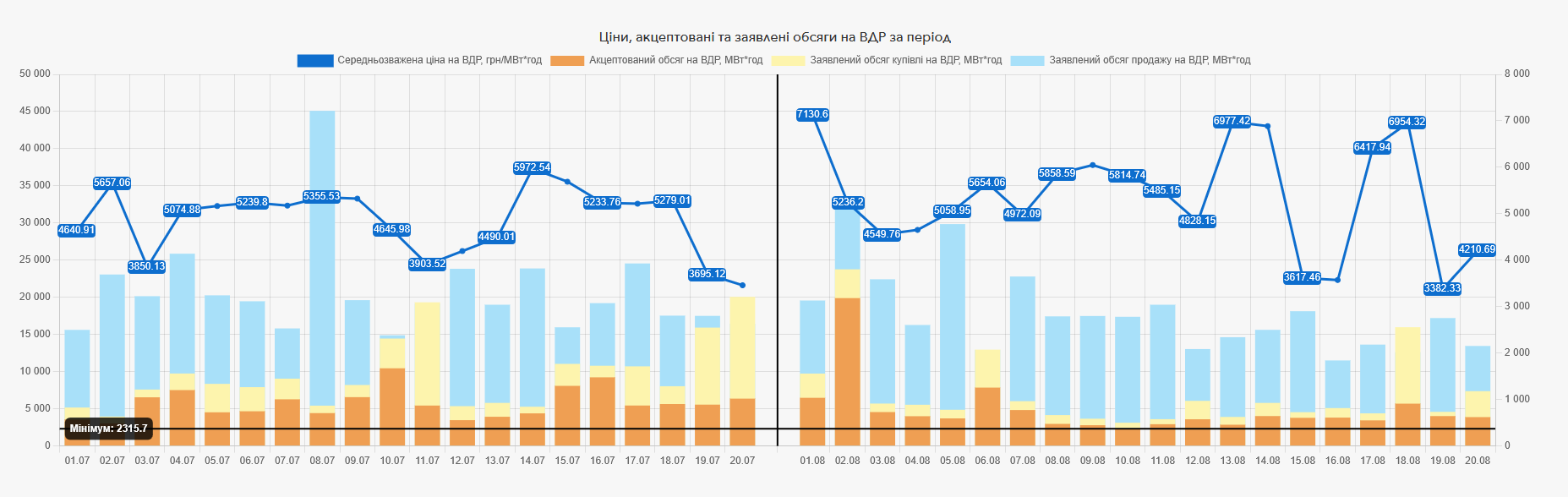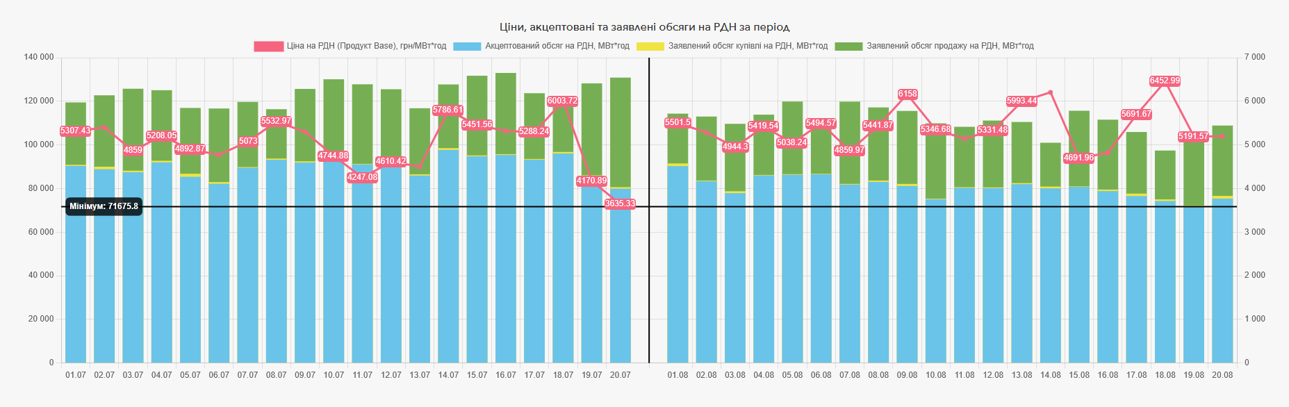 Обсяг торгів електричною енергією на ринку «на добу наперед» за 20 днів серпня 2025 року становить 1 611 278,6 МВт*год, на внутрішньодобовому ринку акцептовано 97 428,7 МВт*год. У порівнянні з таким же періодом липня обсяг торгів на РДН за 20 днів серпня знизився на 10,75%, пропозиція зменшилася на 10,75%, попит впав на 10,71%.