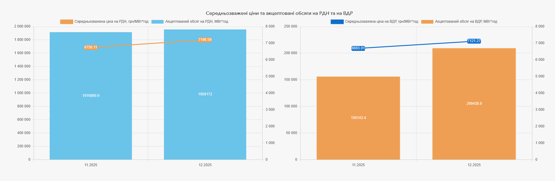 Обсяг торгів електричною енергією на ринку «на добу наперед» за 20 днів грудня 2025 року становить 1 958 172,0 МВт*год, на внутрішньодобовому ринку акцептовано 209 438,9 МВт*год. У порівнянні з таким же періодом листопада обсяг торгів на РДН за 20 днів грудня збільшився на 2,15%, пропозиція зменшилася на 0,29%, попит зріс на 6,82%.