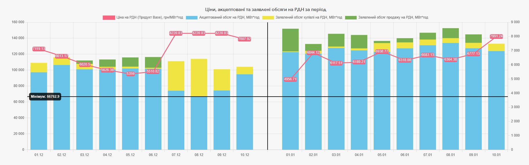 Ціновий індекс електричної енергії базового навантаження на ринку «на добу наперед» за 10 днів січня 2026 року становить 6 518,11 грн/МВт*год. Середньозважена ціна купівлі-продажу електричної енергії на РДН за першу декаду січня цього року становить 6 622,34 грн/МВт*год. На внутрішньодобовому ринку середньозважена ціна акцептованої протягом 10 днів січня електроенергії становить 6 562,14 грн/МВт*год.