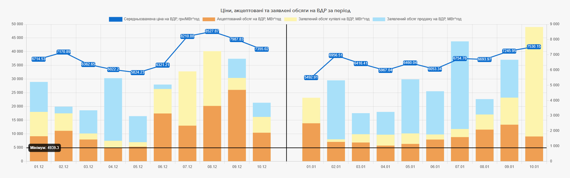 Обсяг торгів електричною енергією на ринку «на добу наперед» за 10 днів січня 2026 року становить 1 262 699,7 МВт*год, на внутрішньодобовому ринку акцептовано – 90 831,2 МВт*год. У порівнянні з першою декадою грудня минулого року обсяг торгів на РДН за першу декаду січня цього року збільшився на 37,33%, на ВДР обсяг торгів зменшився на 27,81%.