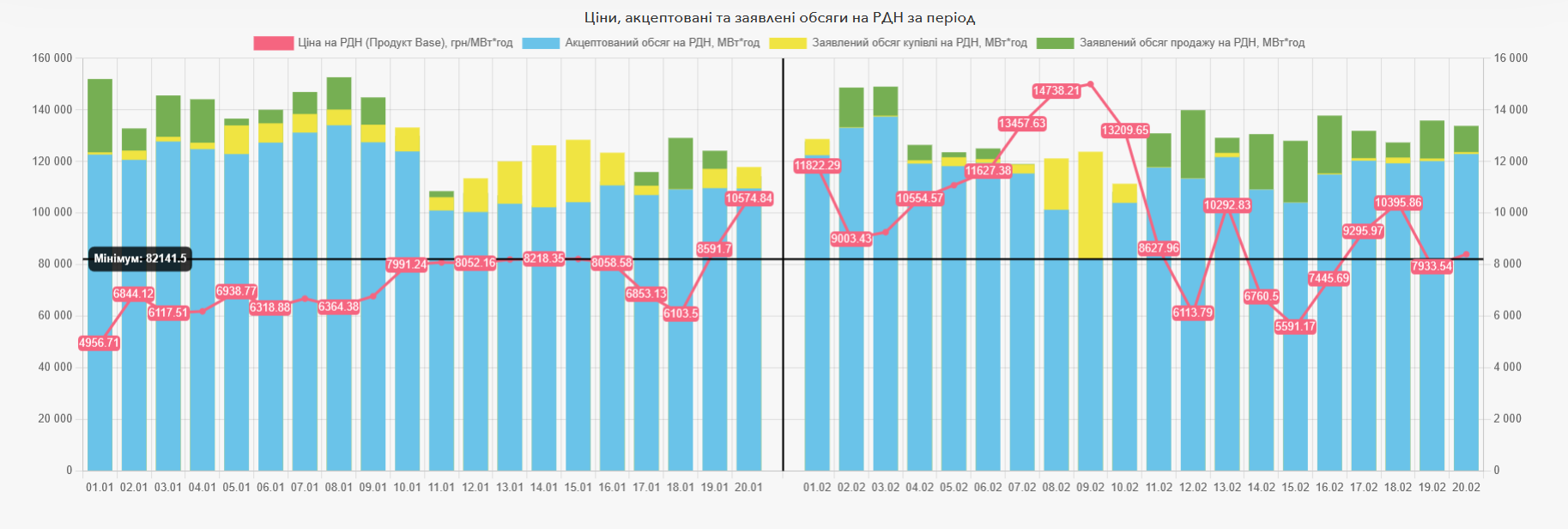 Обсяг торгів електричною енергією на ринку «на добу наперед» за 20 днів лютого 2026 року становить 2 316 094,9 МВт*год, на внутрішньодобовому ринку акцептовано 192 718,8 МВт*год. У порівнянні з таким же періодом січня обсяг торгів на РДН за 20 днів лютого цього року знизився на 0,18%, пропозиція зменшилася на 0,58%, попит впав на 3,33%.