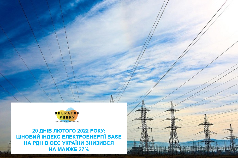 20 ДНІВ ЛЮТОГО 2022 РОКУ:  ЦІНОВИЙ ІНДЕКС ЕЛЕКТРОЕНЕРГІЇ BASE НА РДН В ОЕС УКРАЇНИ ЗНИЗИВСЯ НА МАЙЖЕ 27%
