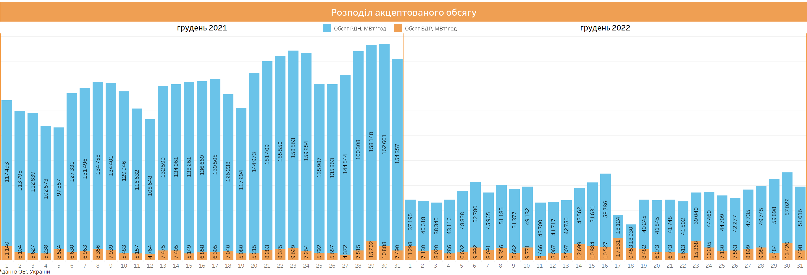 Протягом грудня на РДН було акцептовано 1 380583 МВт*год електричної енергії, на ВДР - 269 319 МВт*год. Найбільш дефіцитною на РДН і ВДР була перша декада грудня.
