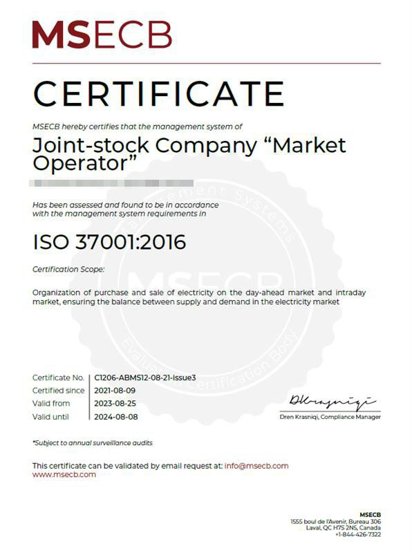 The JSC «Market Operator» successfully passed the annual external audit provided by PECB MS, being accredited by the International Organization for Certification (ISO), and received an international certificate of compliance of the company's anti-corruption policy with the requirements of ISO 37001.