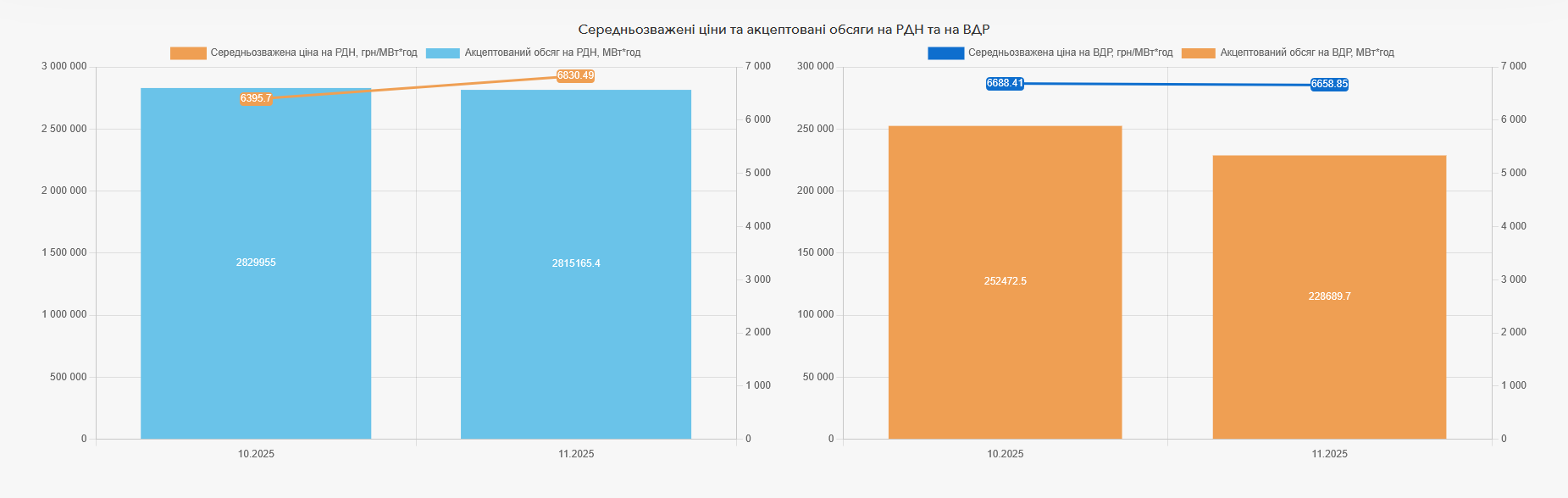 Обсяг торгів на ринку «на добу наперед» зменшився на 0,52%, на внутрішньодобовому ринку впав на 9,42%, і за листопад 2025 року на обох сегментах ринку акцептовано 3 043 855,1 МВт*год. На РДН у листопаді цього року попит, у порівнянні з жовтнем, зріс на 0,66%, а пропозиція зменшилася на 10,00%. На ВДР попит впав на 15,50%, пропозиція зменшилася на 22,04%.