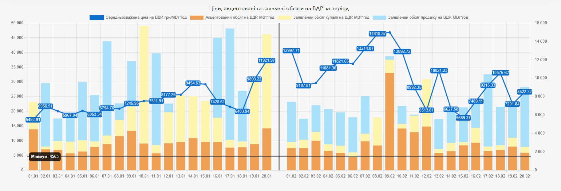 Обсяг торгів електричною енергією на ринку «на добу наперед» за 20 днів лютого 2026 року становить 2 316 094,9 МВт*год, на внутрішньодобовому ринку акцептовано 192 718,8 МВт*год. У порівнянні з таким же періодом січня обсяг торгів на РДН за 20 днів лютого цього року знизився на 0,18%, пропозиція зменшилася на 0,58%, попит впав на 3,33%.