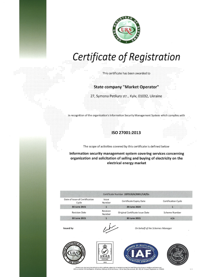 За результатами сертифікаційного аудиту ДП «Оператор ринку» отримало сертифікат відповідності системи управління інформаційною безпекою вимогам міжнародного стандарту ISO/IEC 27001:2013 у сфері послуг з організації та проведення купівлі-продажу електричної енергії на ринку електричної енергії.